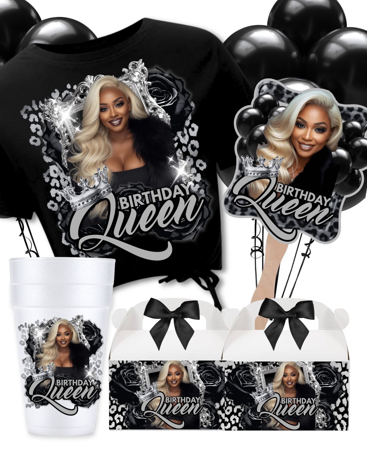 - Description: Sleek black-and-silver design with roses, silver crown, and shimmer. Perfect for luxury all-black parties.
