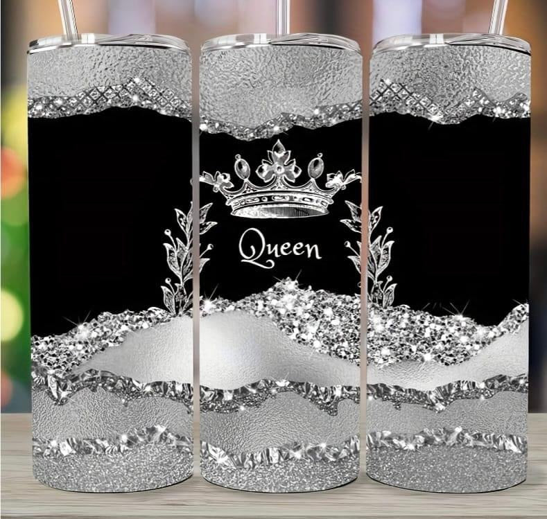 Elevate your drinkware collection with our Queen Crown Sublimation Tumbler, designed for those who embrace elegance and royalty. This sleek, 20oz stainless steel tumbler features a luxurious black backdrop adorned with a shimmering silver crown, the word “Queen,” and intricate leaf accents, making it a perfect choice for queens at heart. The tumbler is detailed with sparkling silver textures resembling crushed diamonds and glitter, adding a sophisticated and glamorous touch to your everyday hydration.